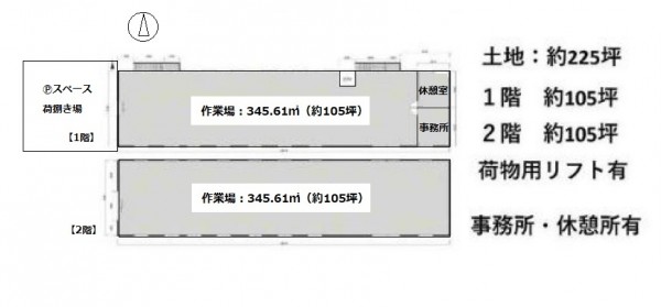 | 設備 | ・リフト付 ★1階倉庫/事務所/作業場:345.61㎡(約105坪) 2階倉庫/作業場:345.61㎡(約105坪) 延べ:691.22㎡(約210坪) ★Ⓟ空地部分:数台可能 ★荷物用リフト ★WC水洗・給湯器あり ■市街化調整区域 |