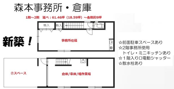 設備 | ★1階:倉庫/車庫/軽作業場~約9坪 2階:事務所仕様~約9坪 延べ:61.46㎡(18.59坪) ★Ⓟ前面空地:車種により1~2台可(1階内部入庫も可) ★1階:電動シャッター・手洗シンク・照明 ★2階:WC・ミニキッチン・収納・照明 ★外部:散水栓あり |