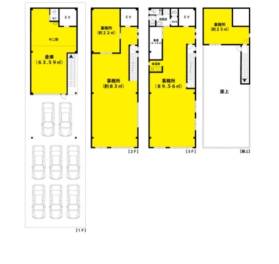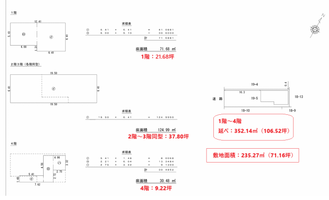設備 | ★1階:71.68㎡(21.68坪)倉庫/作業場など 2階:124.99㎡(37.80坪)事務所など 3階:124.99㎡(37.80坪)倉庫/作業場など 4階:30.48㎡(9.22坪)フリールーム 延べ:352.14㎡(106.52坪) ★敷地面積:235.27㎡(71.16坪) ★Ⓟ前面スペース:数台可能 ★電動シャッター:W3,500 ★荷上げ用エレベーターあり ★屋上スペースあり |