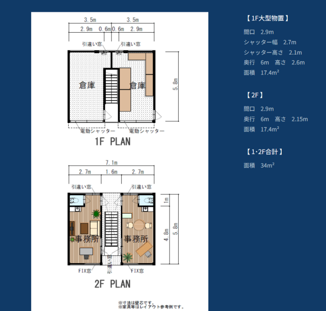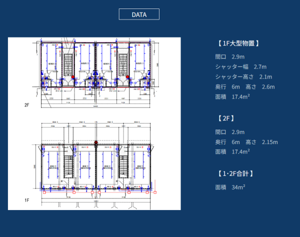 | 設備 | ・軽作業可能 ★1階倉庫/作業場:17.40㎡(5.26坪) 2階事務所:17.40㎡(5.26坪) 延べ:34.80㎡(10.52坪) ★Ⓟスペース:敷地内1台可(内部入庫も可) ★1階:電動シャッター・屋外水栓・簡易手洗い場・LED照明 ★2階:ウオシュレWC・簡易手洗い場・LED照明・エアコン ■階段は共用 |