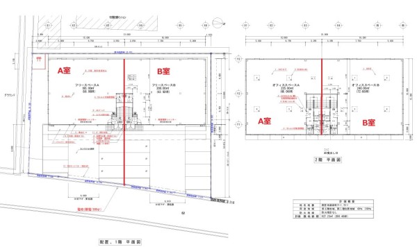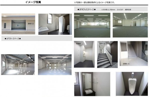| 設備 | ★1F倉庫/作業場:208.00㎡(62.92坪) 2F事務所:240.00㎡(72.60坪) 延べ:448.00㎡(135.52坪) ★Ⓟ前面空地:数台可能 ★玄関アルミ扉(防犯ガラス・電気錠) ★1Fスロップシンク・WR付トイレ ★電動シャッター:H3,150 W4,150 ★2F事務所部エアコン天井型:6台 ★2F男女別WC、湯沸室 ★天井高:1F3,800 2F2,700 ★モニター付インターホン ★2F:OAフロア ★床耐荷重:1F=5000kg/㎡ 2F=300kg/㎡ ■契約形態:【普通賃貸借契約】2年自動更新・解約予告6ヵ月前 ■借主様負担の改装・改造工事は貸主指定業者施工が条件となります |