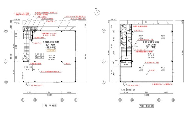 | 設備 | ・大型車進入可能 ★1F倉庫/作業場:224.96㎡(68.05坪) 2F事務所:255.36㎡(77.24坪) 延べ:480.32㎡(145.29坪) ★Ⓟ前面ヤード:数台可能 ★玄関ステンレス両開ドア(電気錠・防犯ガラス) ★フォークリフト用電源 ★1Fスロップシンク、WC(WR便座) ★軽量電動シャッター:H3,150 W4,150 ★2F事務所部エアコン天井型:5台 ★2F男女別WC(WR便座)・給湯室 ★天井高1F:3,700 2F:2,700 ★モニター付インターホン ★2F:OAフロア ★LED照明 ■ご入居に伴う借主様負担改装・改造工事は貸主側指定業者にての施工条件となります |