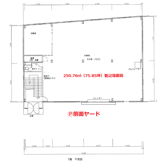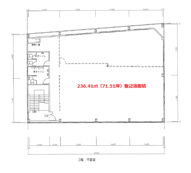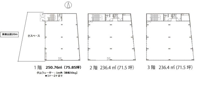 | 設備 | ・大型車進入可能 ★1階:250.76㎡(75.85坪)倉庫/作業場/車庫など 2階:236.41㎡(71.51坪)倉庫/作業場/事務所など 3階:236.41㎡(71.51坪)倉庫/作業場/事務所など 延べ:723.58㎡(218.88坪) ★Ⓟ前面空地:数台可能 ★ダムウェーダー 【1ⅿ角:最大積載50kg】1F~2F ★各階WC(男女別)・流し台・照明 ■2020年6月:改修耐震工事済み ■検査済証あり |