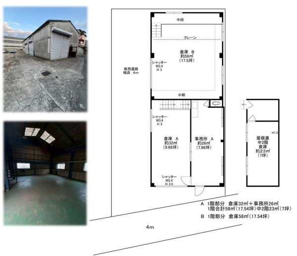 | 設備 | ★倉庫A 1階:32㎡(9.68坪) 事務所A 1階:26㎡(7.86坪) 中2階倉庫:23㎡(7坪) ★倉庫B 1階:58㎡(17.5坪) ★延べ:139㎡(42.04坪) ★Ⓟ空地分部:3台程度可 ★手動シャッター:3箇所 ★ホイストクレーン【残置物】 ★和WC・流し台 【注】物件進入道路が狭いです。近隣民家あり。 |