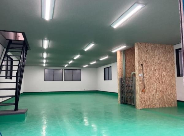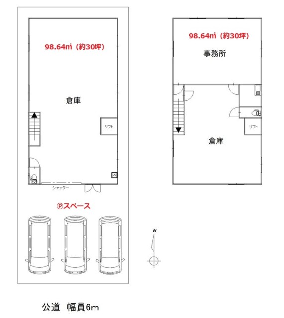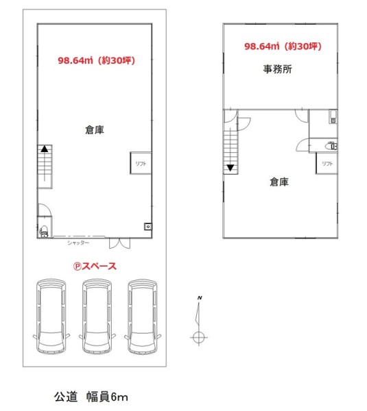 | 設備 | ・リフト付 ★全面リニューアル工事済み ★1階:98.64㎡(29.83坪)倉庫/作業場など 2階:98.64㎡(29.83坪)事務所/倉庫/作業場など 延べ:197.28㎡(59.67坪) ★Ⓟ前面空地:3台程度可(間口9M×奥行7M) ★手動シャッター:2面 ★WC2箇所・流し台・手洗場・LED照明 ★荷物用リフト ■各電気系設備のメンテは借主様負担 |