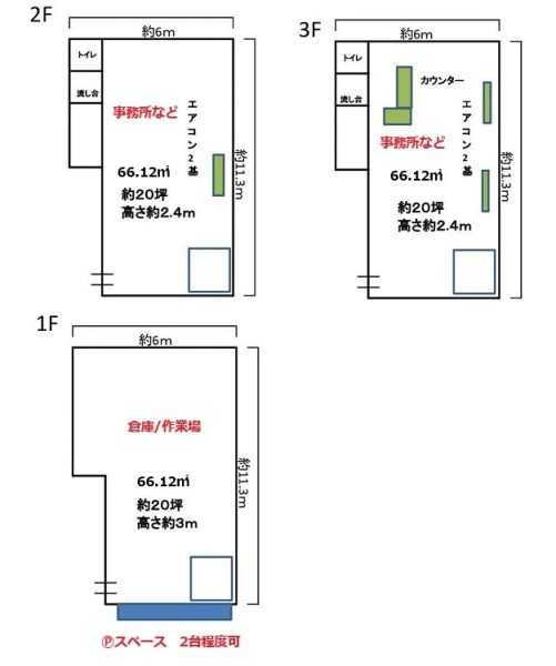 | 設備 | ★1階:66.12㎡(20坪)倉庫/作業場/車庫など 2階:66.12㎡(20坪)事務所/作業場など 3階:66.12㎡(20坪)事務所/作業場など 延べ:198.36㎡(60坪) ★Ⓟ前面空地:2台程度可 ★手動シャッター ★2階~3階:エアコン(メンテは借主) ★2階~3階:WC・流し台・照明 |
