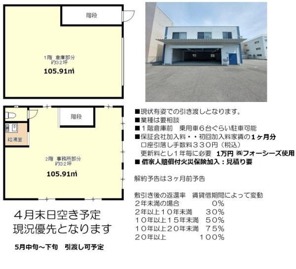 | 設備 | ★1階:105.91㎡(32坪)倉庫/作業場/車庫など 2階:105.91㎡(32坪)事務所/作業場など 延べ:211.82㎡(64.07坪) ★Ⓟ前面空地:5~6台程度可 ★手動シャッター ★1階~2階:LED照明 ★2階:WC・流し台 ■敷引年数スライド式(下記返還率) *2年未満0%~10年未満30%~15年未満50% ~20年未満75%~20年以上100% |