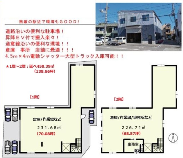 | 設備 | ・大型車進入可能 ・リフト付 ★1階:231.68㎡(70.08坪)倉庫/作業場など 2階:226.71㎡(68.57坪)事務所/倉庫/作業場など 延べ:458.39㎡(138.66坪) ★Ⓟ空地分部:5台程度可 ★電動シャッター:H4,500×W4,000 ★荷物用リフト【残置物】 ★WC・流し台 |