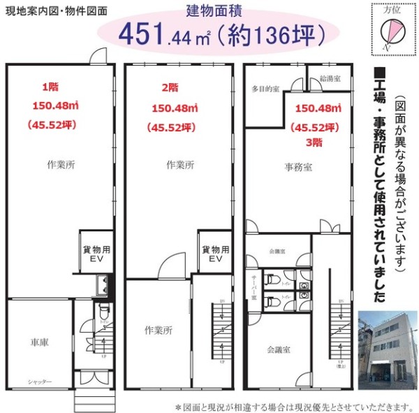 | 設備 | ・リフト付 ★1階:150.48㎡(45.52坪)車庫/作業場 2階:150.48㎡(45.52坪)作業場 3階:150.48㎡(45.52坪)事務所など 延べ:451.44㎡(136.56坪) ★Ⓟ1階内部入庫可 ★男女別WC ★エアコン:1F×3基 2F×3基 3F×5基 ★荷物用EV・シャッター・照明器具【全て残置物扱い】 |