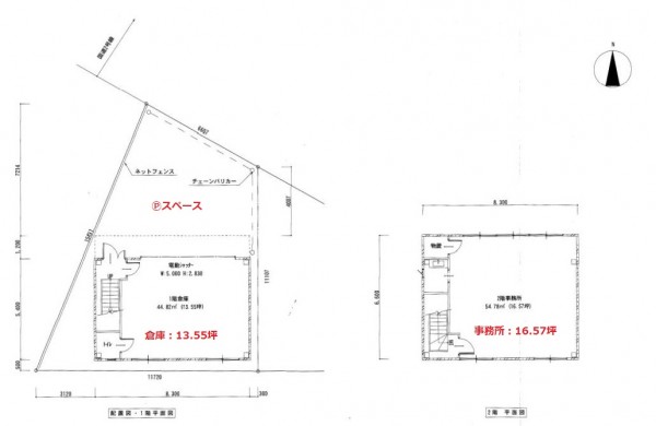 | 設備 | ★1F:44.82㎡(13.55坪)倉庫/作業場 2F:54.78㎡(16.57坪)事務所 延べ:99.60㎡(30.12坪) ★Ⓟ前面空地:2~3台程度可 ★WC、流し台、照明、 ★電動シャッター:H2,830×W5,000 |