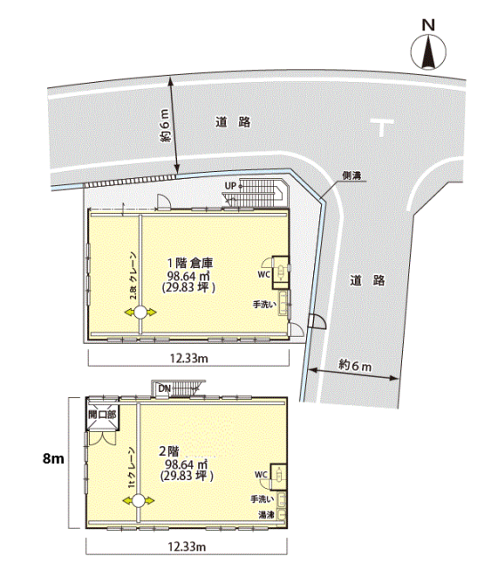| 設備 | ・ホイストクレーン ★1階:98.64㎡(29.83坪)倉庫/工場 2階:98.64㎡(29.83坪)倉庫/作業場/事務所など 延べ:197.28㎡(59.67坪) ★Ⓟ車輌:内部入庫可 ★1階:2.8tクレーン1基 2階:1tクレーン1基 ★1階天高:4,900 |
