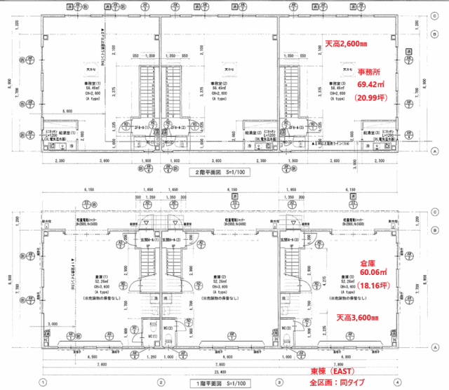 | 設備 | ★IBARAKI BASE 東棟EAST:3区画共~同タイプ(01・02・03) ★下記、表示面積は1区画あたりの面積です ★1階:60.06㎡(18.16坪)倉庫/軽作業場 2階:69.42㎡(20.99坪)事務所仕様 延べ:129.48㎡(39.16坪) ★Ⓟ前面空地:各区画3台可(無料) ★別途・敷地内Ⓟ幅2,300:11,000円/台【5台枠あり】敷・礼なし ★天高:1階3,600 2階2,600 ★軽量電動シャッター:H2,400×W2,800 ★外部:散水栓・ポスト・社名掲示板・モニターホン ★外部共用部分:防犯カメラ設置 ★1階:コンクリ土間防塵塗装・洗濯機置場・手洗シンク・WRトイレ・LED照明 ★2階:タイルカーペットOAフロア・天カセエアコン・モニターホン IH付ミニキッチン(電気温水器)・WRトイレ・LED照明 【注】近隣住宅地の為、【騒音・振動・臭気】を伴う業種は不可 【注】危険物の保管は禁止 【注】物件周辺道路:3t規制道路多し 【注】建物全体の火災監視システムがセコム㈱の為、各テナント様の個別機械警備導入はセコム㈱限定となります |