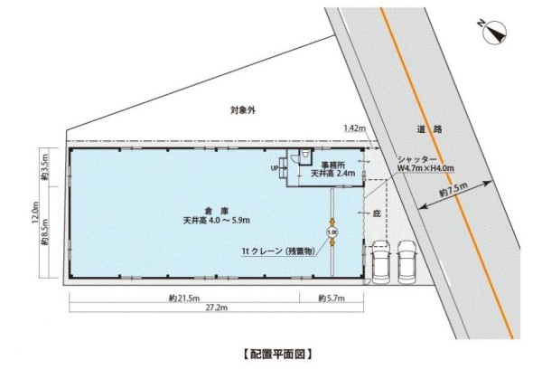 | 設備 | ・ホイストクレーン ★検査済証取得済 ★貸主インボイス取得済み ★平屋倉庫:326.40㎡(98.73坪)内、小型事務所部あり ★Ⓟ前面空地:2台程度可 ★電動シャッター:H4,000×W4,700 ★1tクレーン:残置物 ★洋式WC ★天高:4,000~5,900 |