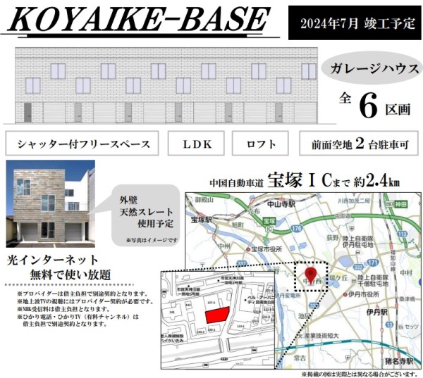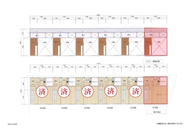 設備 | ★1F:28.50㎡ 2F:33.68㎡ ★2Fバルコニー:3.94㎡ ロフト部:8.06㎡(屋上部:4.47㎡) ★延べ:62.18㎡+ロフト:8.06㎡ ★P前面空地:各戸2台可(内部も可) ★電動シャッター ★ユニットバス(1014)、WC2箇所、キッチン、洗濯パン、モニターホン ■事業用使用の場合:別途、消防設備点検費・ゴミ処理代要 ■光インターネット無料(プロバイダー契約借主負担) ■地上波TV=プロバイダー契約要 ■ひかり電話・ひかりTV=借主負担別途契約 ■住居使用の場合は非課税(賃料・礼金) |