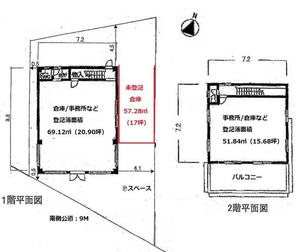 | 設備 | ★1階:69.12㎡(20.90坪)倉庫/店舗/事務所など 2階:51.84㎡(15.68坪)事務所/倉庫など 延べ:120.96㎡(36.59坪)以上、登記簿面積 ★付属倉庫建物(未登記):57.28㎡(17.32坪) ★Ⓟ空地分部:車種により1~2台可 ★手動シャッター:現況内側ドアあり ■引き渡し状態は相談にて(付属建物撤去も可) |