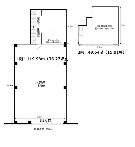 | 設備 | ・大型車進入可能 ★1階:119.93㎡(36.27坪)車庫/倉庫/作業場など 2階:49.64㎡(15.01坪)事務所など 延べ:169.57㎡(51.30坪) ★Ⓟ1階部分:大型車輌入庫可(天高6.5M) ★内部電動シャッター:H4,950×W5,000 |