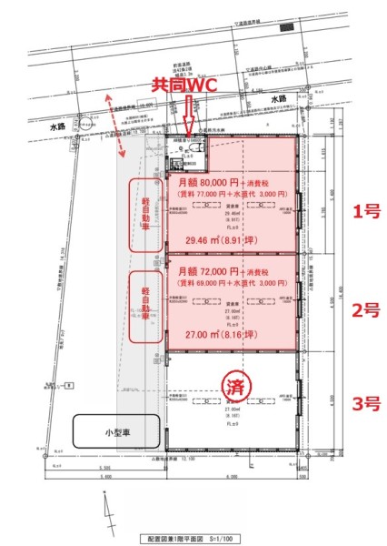 | 設備 | ★【1号】賃料77,000円+水道代3,000円×消費税=88,000円(税込) ★【1号】29.46㎡(8.91坪)倉庫/作業場 ★Ⓟ前面空地:横向き小型車1台可 ★手動シャッター:H2,800×W2,850 ★LED照明・コンセント ★共同トイレ ★外部:散水栓 ■水道代:想定使用料超の場合は追加請求あり |